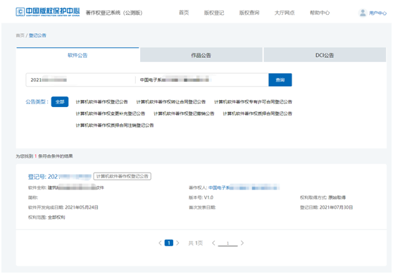 3、输入验证码,即可查询到软件著作权的信息,如下图所示: